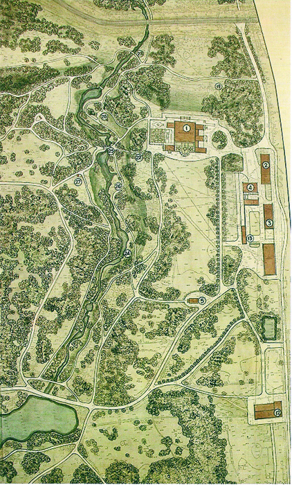 В парке были высажены тысячи деревьев местных широколиственных пород (дуб, липа, клен, ясень), а также экзоты — лиственница сибирская, пихта сибирская, ряд видов декоративных кустарников. В результате породный состав хвойных лесов, существовавших на территории до середины XIX в., существенно изменился. Были проложены пейзажные дороги и дренажная сеть. В 1864 г. южная часть имения была отсечена вновь построенной железной дорогой Лигово — Ораниенбаум.